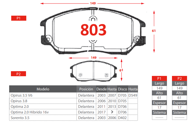 - PASTILLA DE FRENOS DELANTERA KIA OPIRUS 3.5 3.8/ OPTIMA 2.0/ SORENTO 3.5/ SORENTO 3.5/ SSAMGYONG ACTYON SPORT 2.0/ STAVIC 2.2 2.7/ KYRON 2.0/ REXTON 2.9 2.7