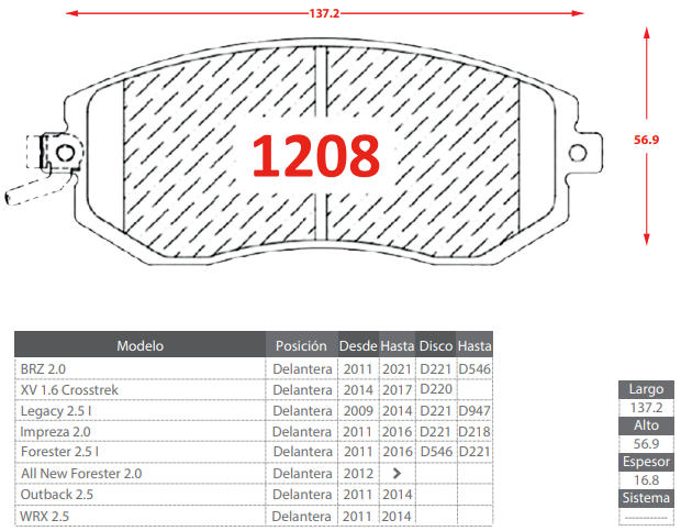 - PASTILLA DE FRENOS DELANTERAS SUBARU FORESTER 2.5/ BRZ 2.0/ XV 1.6/ LEGACY 2.5/ IMPREZA 2.0/ OUTBACK 2.5