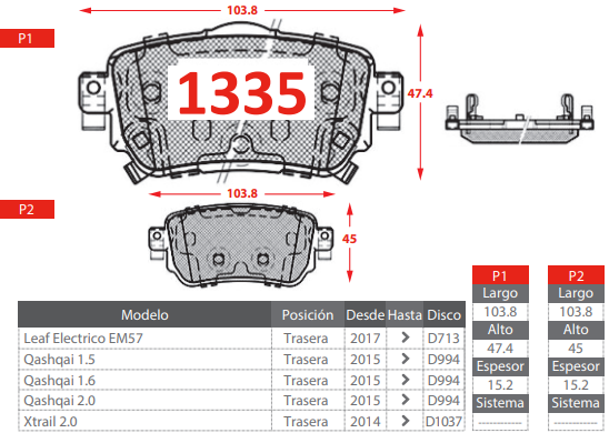 - PASTILLA DE FRENOS TRASEROS NISSAN QASHQAI 1.5 1.6 2.0/ LEAF ELECTRICO EM57/ XTRAIL 2.0