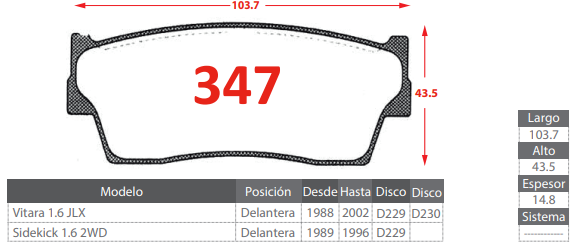 - PASTILLAS DE FRENOS DELANTERAS SUZUKI VITARA 1.6/ SIDEKICK 1.6