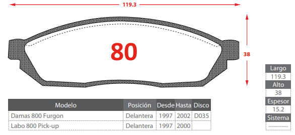 - PASTILLAS DE FRENOS DELANTEROS DAEWOO DAMAS/ LABO 800/ FRONTE 550 800/ MARUTI 800