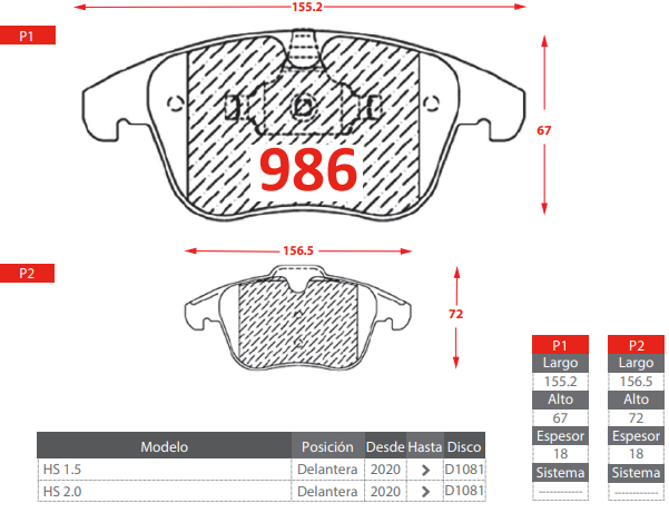 PASTILLAS DE FRENOS DELANTEROS VOLVO S80 1.6 2.0 2.4 2.5 3.0 3.2/ SC70 2.4 3.0 3.2/ V70 1.6 2.0 2.4 2.5 3.0 3.2/ S60 II 1.5 1.6 2.0 2.4 3.0 / MG HS 1.5 2.0