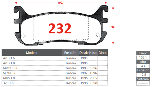 PASTILLAS DE FRENOS TRASERAS MAZDA MIATA 1.8i 1.6/ ARTIS 1.6 1.8/ MX5 1.8/ 323 1.6