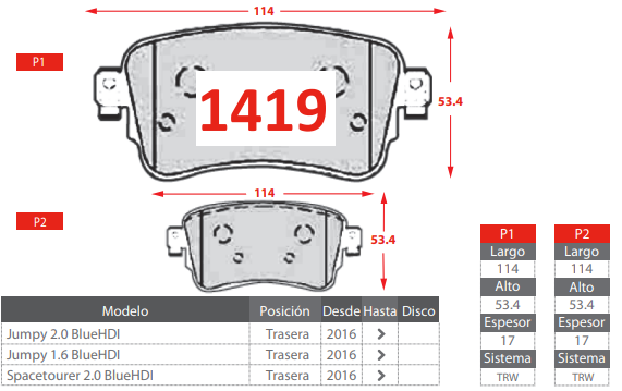 - PASTILLAS DE FRENOS TRASERAS PEUGEOT EXPERT/ TRAVELLER 1.6 2.0/ BLUE HDI/ CITROEN JUMPY 2.0 1.6/ SPACETOURER 2.0